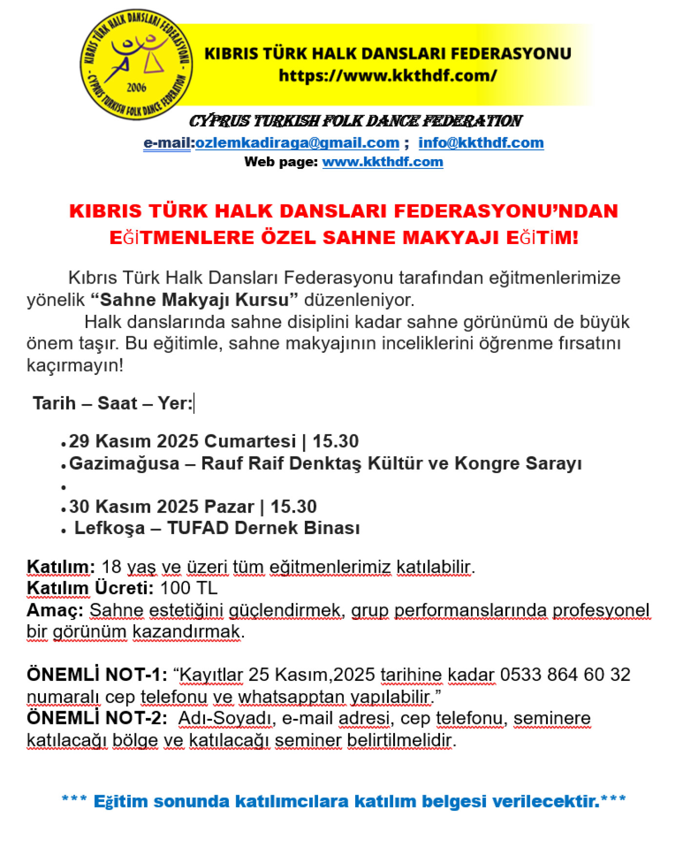 HATIRLATMA VE LEFKOŞA SALON DEĞİŞİKLİĞİ BİLGİSİ KIBRIS TÜRK HALK DANSLARI FEDERASYONU’NDAN EĞİTMENLERE ÖZEL SAHNE MAKYAJI EĞİTİMİ