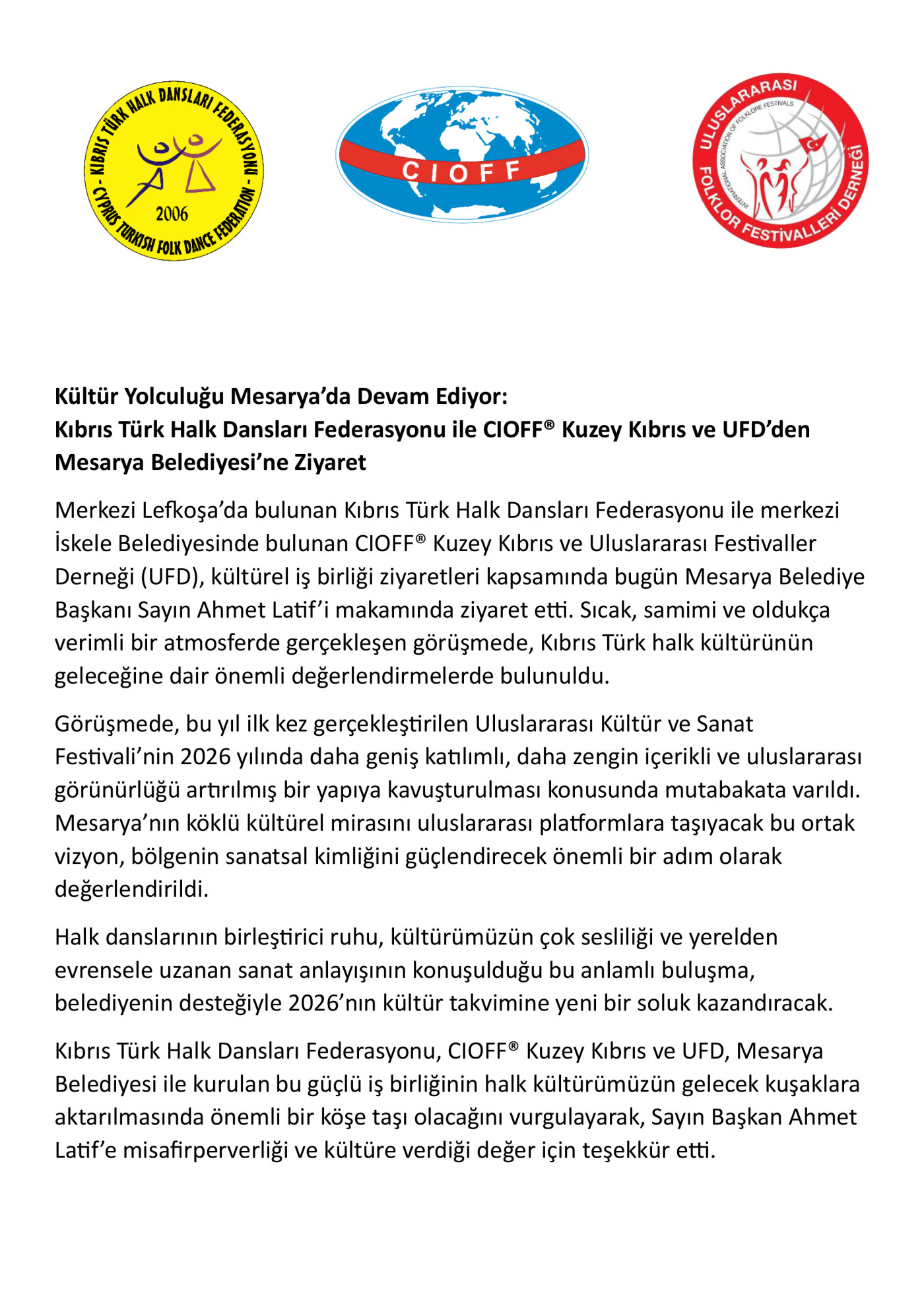 Kıbrıs Türk Halk Dansları Federasyonu, CIOFF® Kuzey Kıbrıs ve UFD, Mesarya Belediyesi ile kurulan bu güçlü iş birliğinin halk kültürümüzün gelecek kuşaklara aktarılmasında önemli bir köşe taşı olacağını vurgulayarak, Sayın Başkan Ahmet Latif’e misafirperverliği ve kültüre verdiği değer için teşekkür etti.